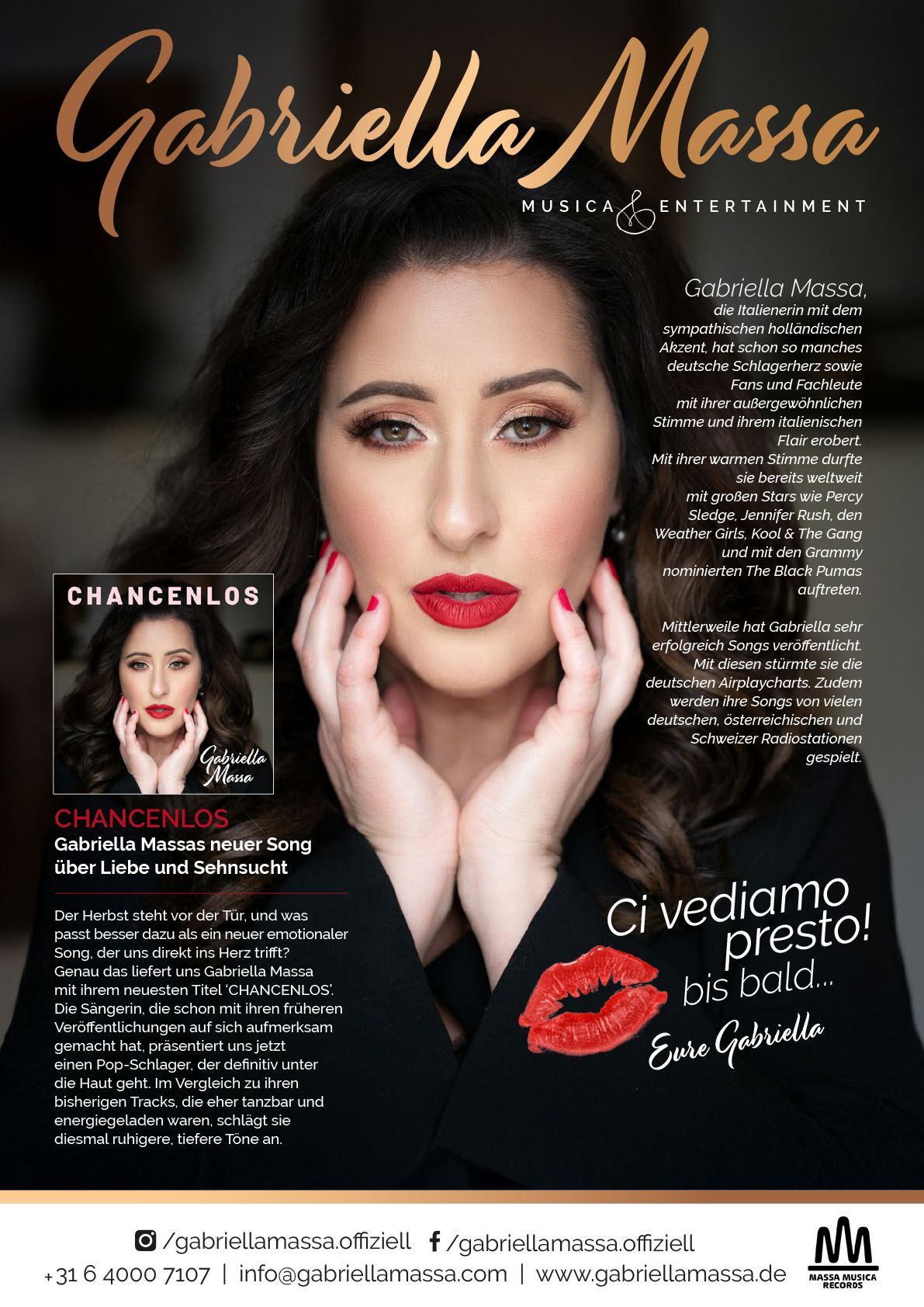 Gabriella Massa machte sich bereits 2020 in der Schlager-Szene einen Namen. Doch ihr musikalischer Werdegang begann viel früher: ihre unverkennbare Sopran-Stimme führte sie auf Bühnen weltweit, auf denen sie unter anderem mit Percy Sledge, Jennifer Rush, den Weather Girls, Kool & The Gang und den Black Pumas performte. Diese Erfahrungen prägen ihren einzigartigen Stil als Entertainerin. Seit ihrem erfolgreichen Start 2023 mit dem eigenen Label Massa Musica Records (LC 96282) hat sich Gabriella Massa als feste Größe im deutschen Schlager etabliert. Mit ihrer kraftvollen Stimme und stilistischer Vielseitigkeit verleiht sie der Musik-Landschaft Deutschlands einen brandneuen, internationalen Touch.